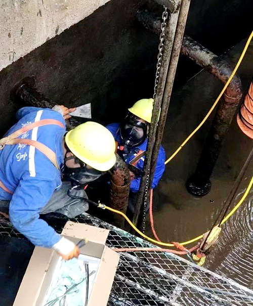 該污泥鋼管因長時間受污水侵蝕,出現了多個穿孔,嚴重影響排泥效果和脫泥進度。因不能長時間停產維修,公司特別制定了有限空間作業方案,并報深圳金達及園區管委會批準后,高效開展了處置工作。